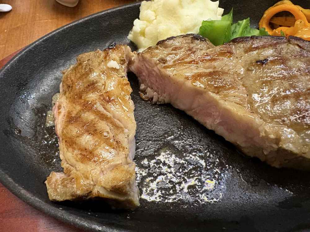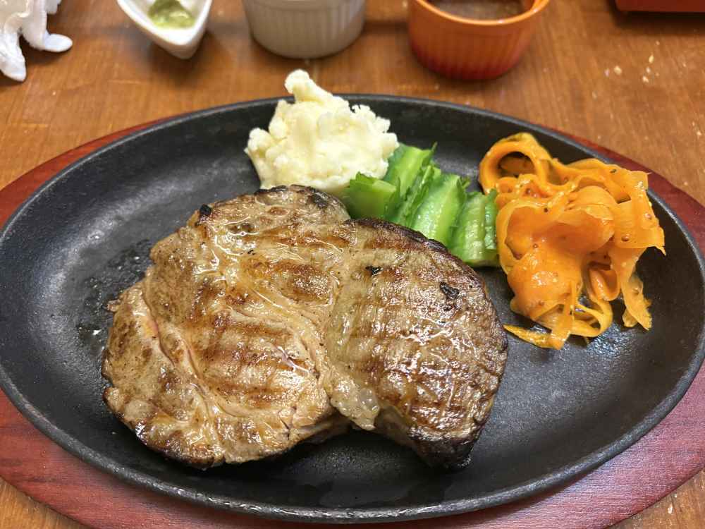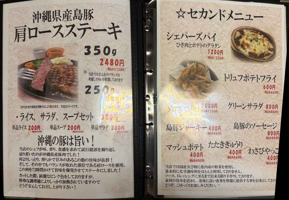 メインメニューは沖縄県産島豚の肩ロースステーキで、350gと250gがある。