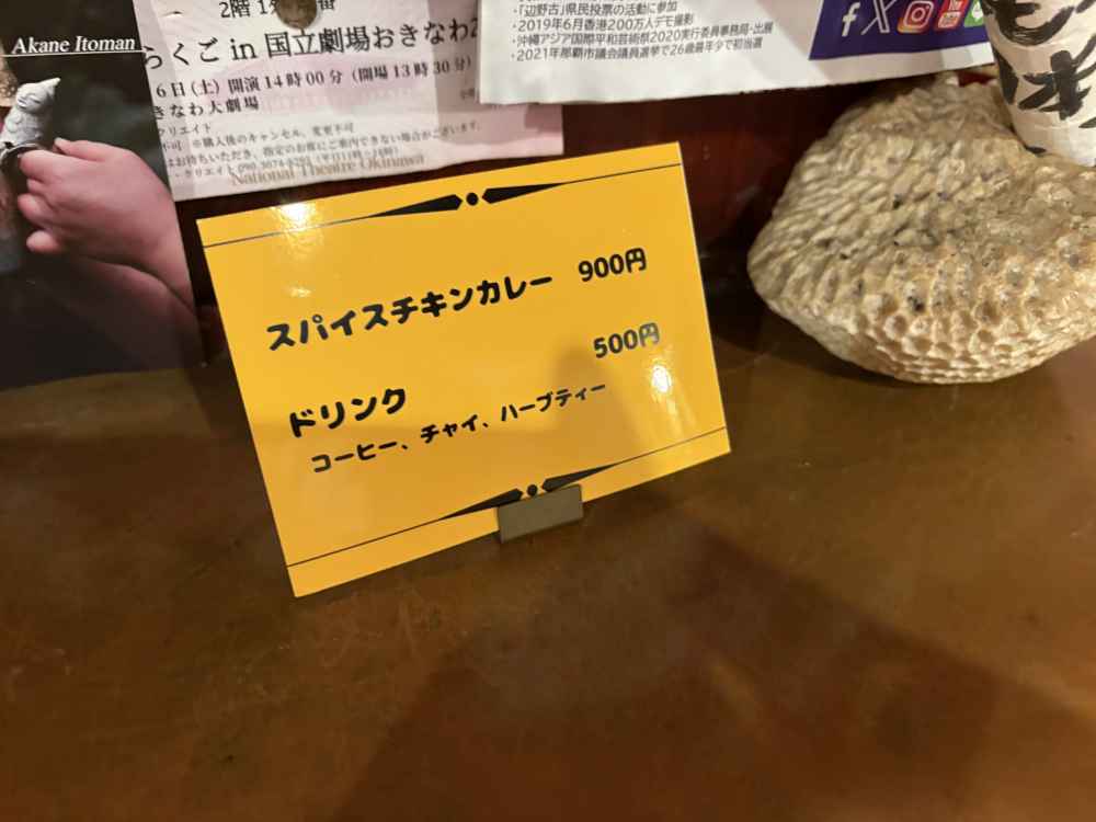 メインはスパイスチキンカレー。ほか、コーヒー、チャイ、ハーブティー。メニューにはないが、ビールもあるとのこと。