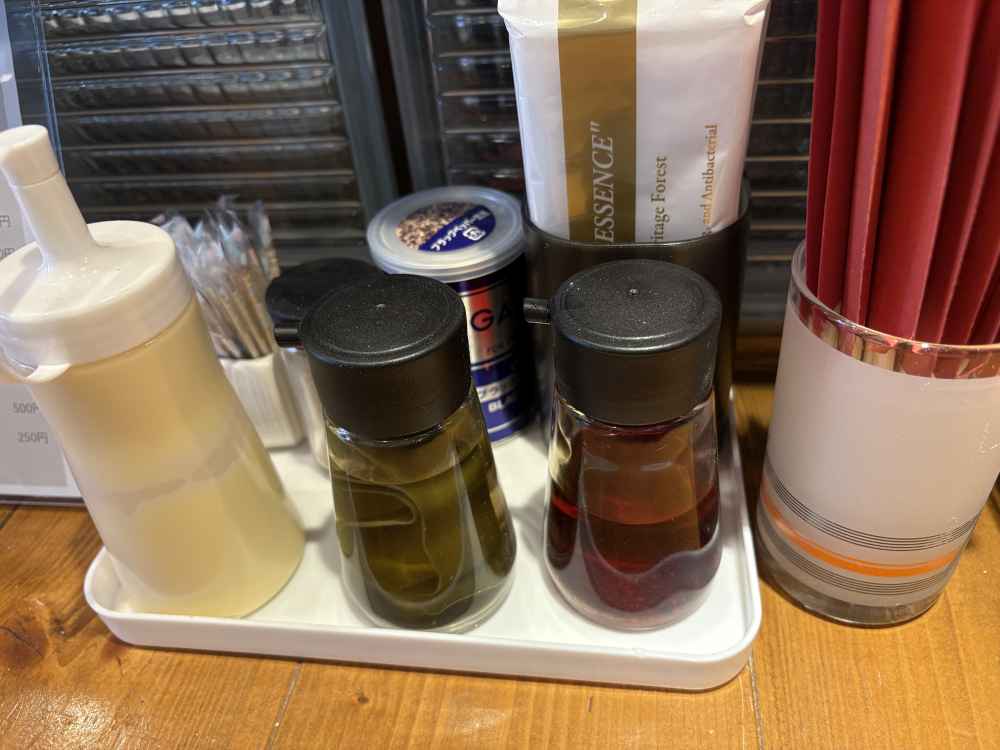 卓上調味料で味変ができる。